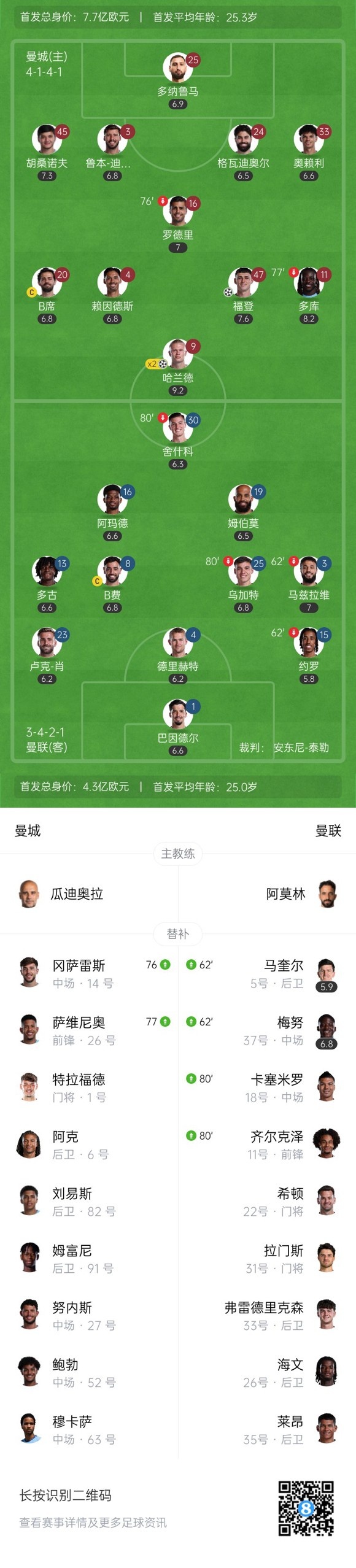 第67分钟,曼城扩大比分!曼联后场再失误,B席长传直塞给到哈兰德单刀机会推射破门,曼城3-0曼联。↓