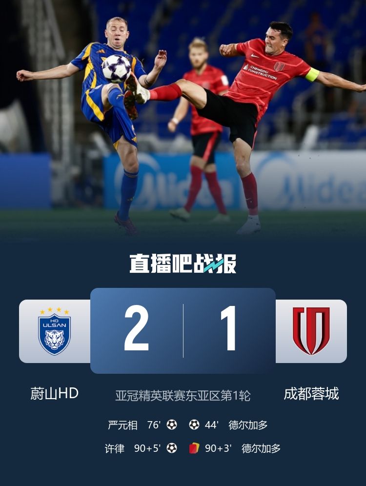 直播吧9月17日讯 北京时间9月17日18:00,亚冠精英联赛东亚区第1轮,成都蓉城做客蔚山文殊体育场挑战蔚山HD。上半场,罗慕洛开场打门偏出,周定洋推射稍稍偏出,德尔加多劲射破门;下半场,蹇韬多次做出精彩扑救,严元相补射扳平,德尔加多染红,许律绝杀。最终,蓉城客场1-2不敌蔚山HD。