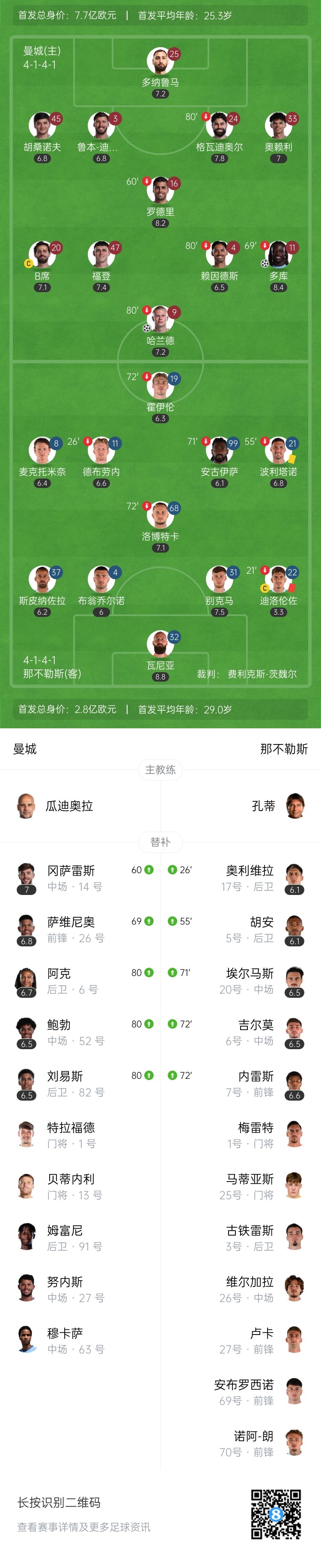 第56分钟,曼城弧顶位置连续的短传配合,罗德里做球,福登跟进转身送出精妙挑传,哈兰德头球吊射入网,曼城1-0领先↓