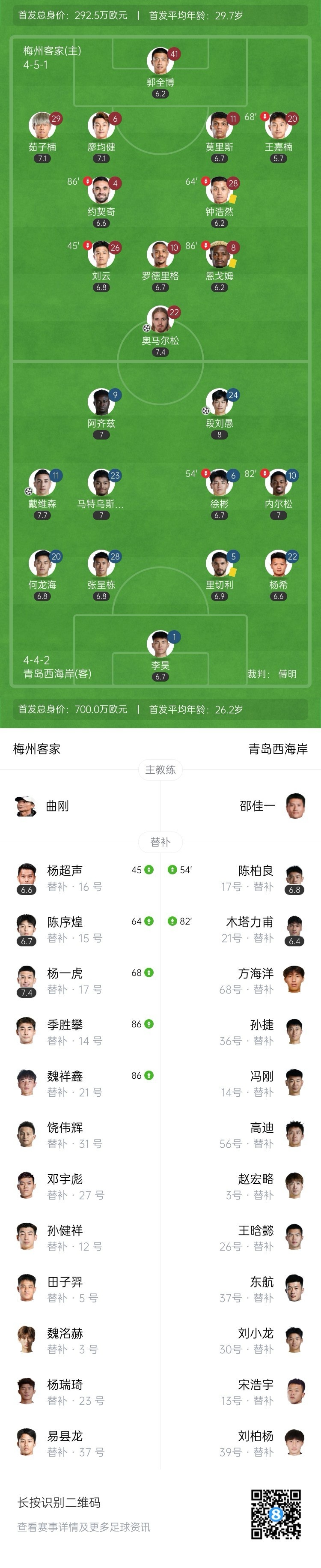 直播吧9月20日讯 北京时间9月20日19:35,中超第25轮,梅州客家坐镇五华奥体中心惠堂体育场迎战青岛西海岸。上半场,段刘愚任意球直接破门,奥马尔松近距离端射扳平比分;下半场,戴维森助西海岸再度领先,此后双方均未破门。最终,梅州客家1-2不敌青岛西海岸。梅州客家4轮不胜,24场积17分跌至降级区,西海岸结束3连败,24场30分排名第10位。