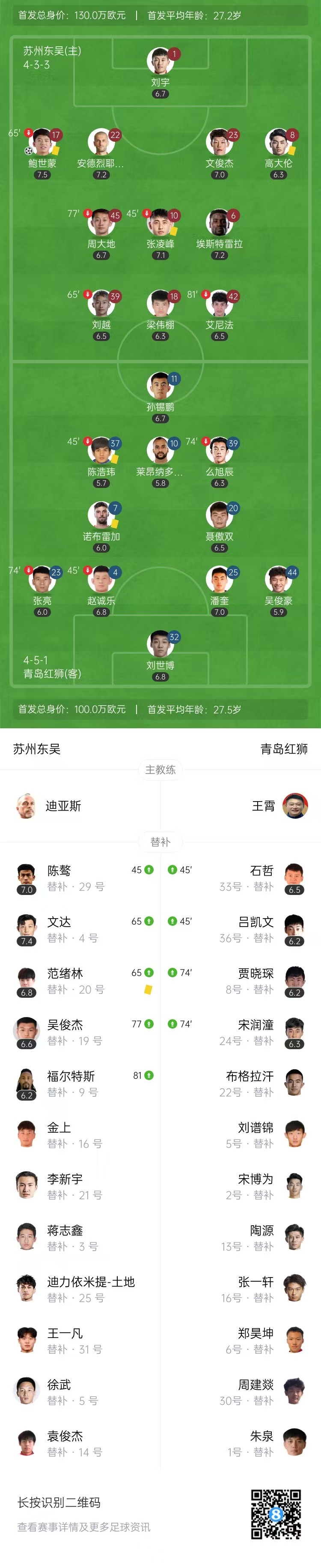 第3分钟,鲍世蒙头球攻门被后卫挡下,随后他抢下第二点抽射破门,苏州东吴1-0青岛红狮。↓