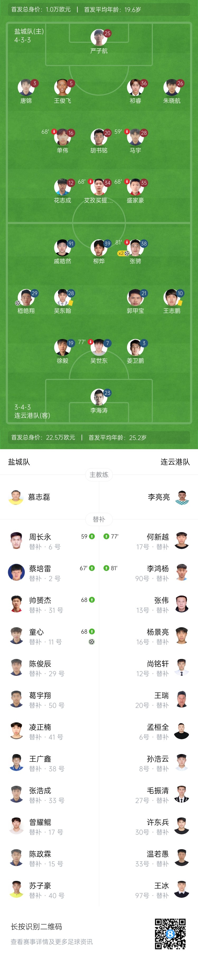 直播吧9月20日讯 苏超第12轮,盐城队主场迎战连云港队。上半场,张骋先拔头筹。易边再战,张骋上演梅开二度,嵇皓翔破门,童心扳回一城。最终盐城主场1-3连云港。积分榜方面,盐城19分第四,连云港15分第八。