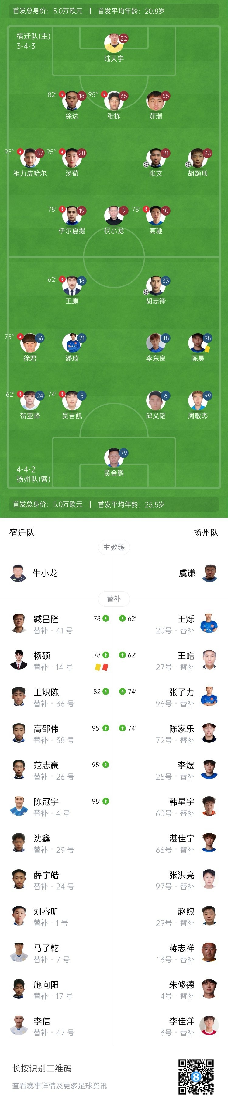 第24分钟,扬州中场抢断发动反击,胡志锋杀入禁区低射破门,宿迁1-1扬州!↓