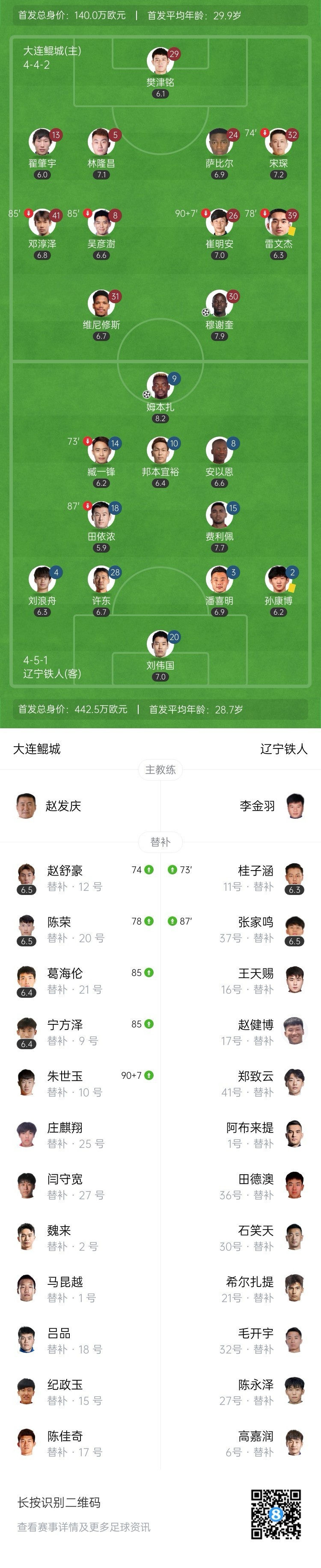 辽宁铁人扳平!姆本扎破门+联赛22球领跑射手榜!第55分钟,费利佩左路传中落点精准,姆本扎摆脱防守球员抢点头球破门,大连鲲城1-1辽宁铁人!↓