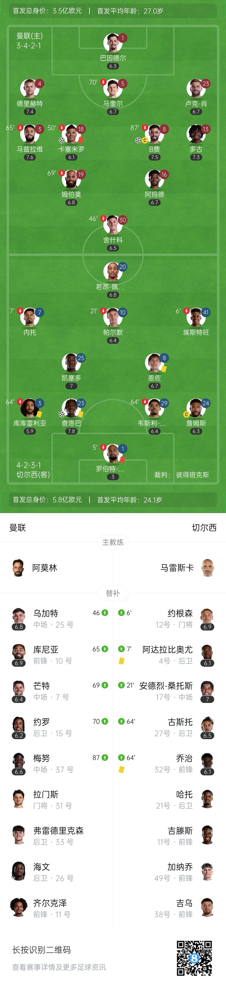 红魔2球领先!卡塞米罗头球破门,卢克-肖助攻!第37分钟,多古头球顶回中路,里斯-詹姆斯禁区内解围没有踢远,卢克-肖奋力头球摆渡,卡塞米罗头球接力破门,切尔西0-2曼联!↓