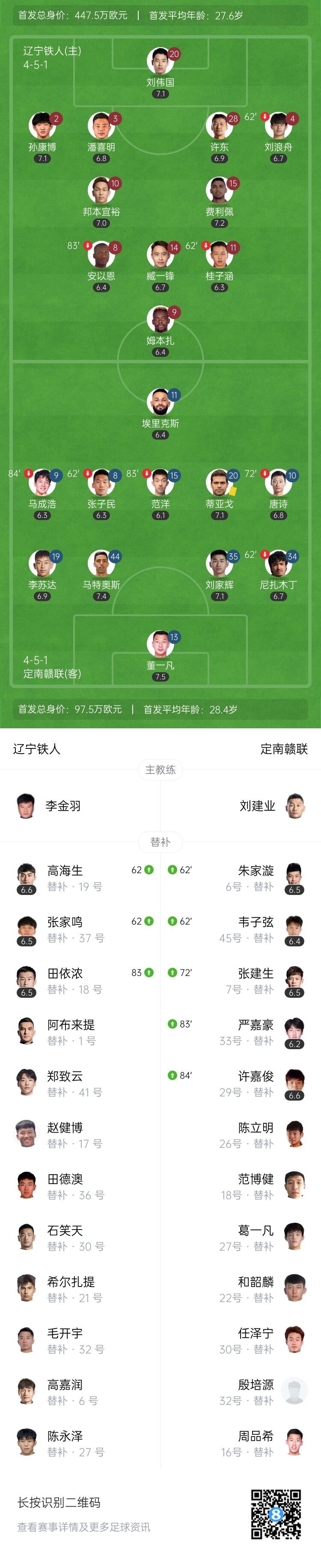 直播吧9月27日讯 北京时间9月27日晚上19:00,中甲第24轮,辽宁铁人坐镇铁西体育场迎战定南赣联。上半场,主队围攻无果。下半场,双方进攻哑火。全场结束,辽宁铁人0-0定南赣联。本场过后,辽宁铁人积52分继续领跑积分榜,定南赣联积36分暂列第7。