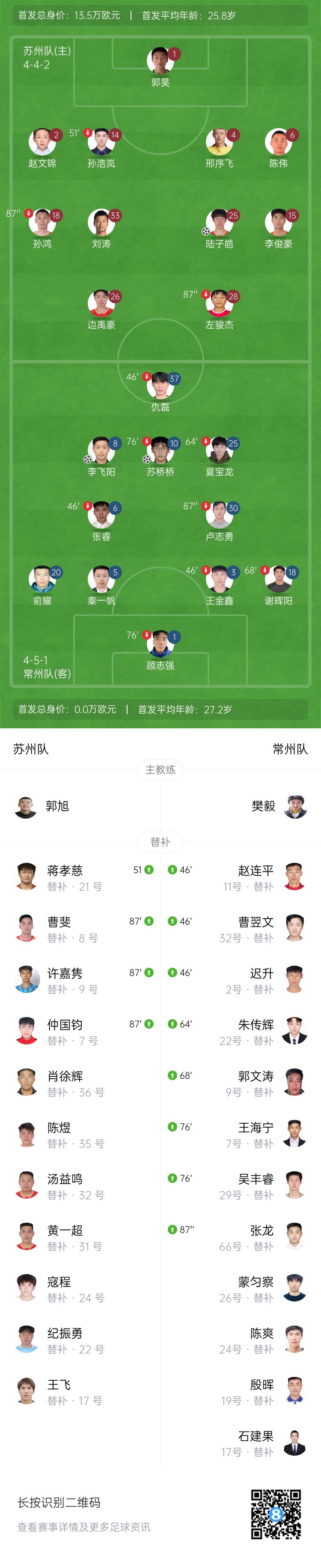 直播吧9月27日讯 北京时间19:35,苏超第13轮苏州队vs常州队。上半场,苏桥桥帮助常州队取得领先;陆子皓破门扳平比分。随后苏州队获得点球,孙鸿点射反超!下半场,常州队绝平!苏州队94分钟绝杀!最终,苏州队近6轮首胜,第10名收官无缘淘汰赛;常州队位列第12。