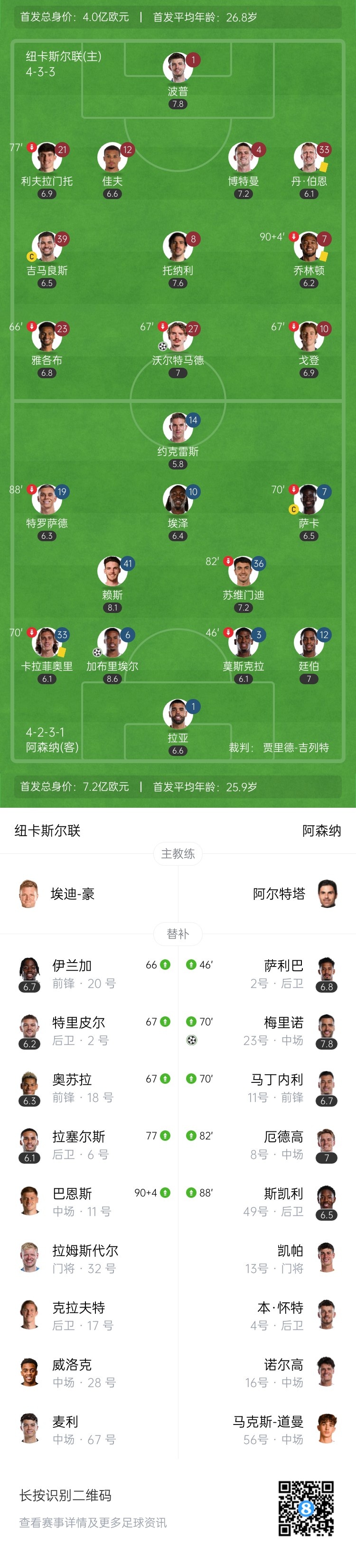 第34分钟,托纳利角球配合,随后右脚再往禁区内传中,禁区内沃尔特马德头球破门!纽卡1-0领先阿森纳↓