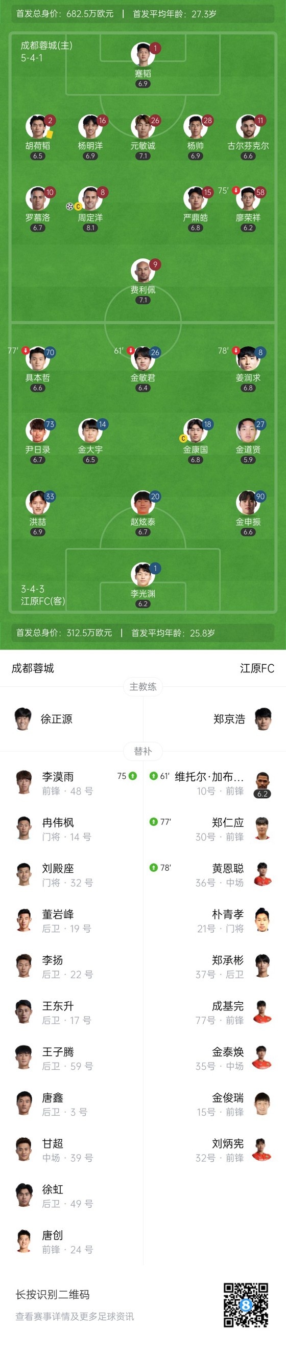 第35分钟,成都首开记录!左路角球开到禁区后点杨帅头球摆渡到点球点附近周定洋凌空抽射破门,成都1-0江原。↓