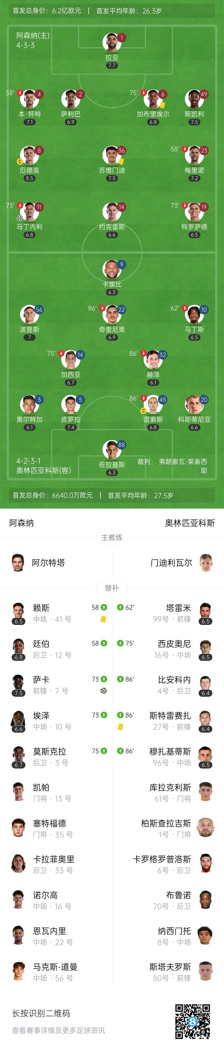 全场比赛结束,阿森纳2-0奥林匹亚科斯。