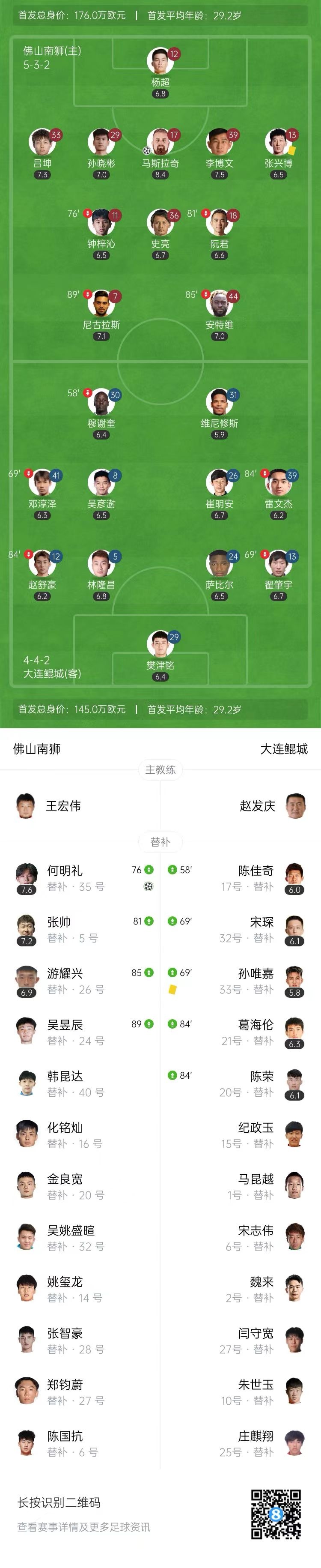 直播吧10月4日讯 北京时间10月4日19:30,中甲第25轮,佛山南狮坐镇主场佛山南海体育中心体育场迎战大连鲲城。上半场,张兴博飞铲染黄。下半场,马斯拉奇角球铲射破门,何明礼反击世界波再下一城。全场比赛结束,佛山南狮2-0击败大连鲲城,先赛一场暂时超出降级区4分。