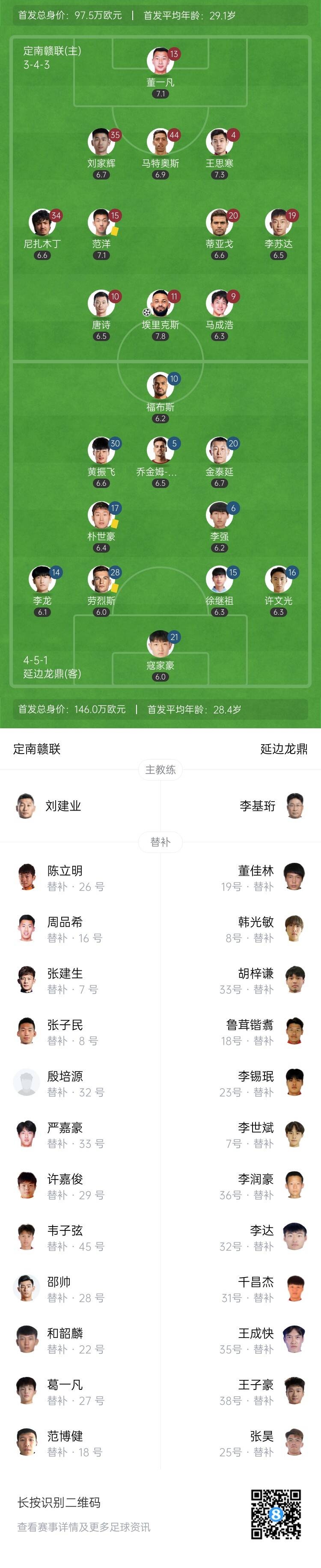 直播吧10月4日讯 北京时间10月4日晚上19:30,中甲第25轮,定南赣联坐镇定南青少年足球训练中心迎战延边龙鼎。上半场,埃里克斯破门。下半场,李苏达建功,福布斯扳回一球。全场结束,定南赣联2-1延边龙鼎。本场过后,定南赣联积39分排名第6,延边龙鼎积42分排名第4。