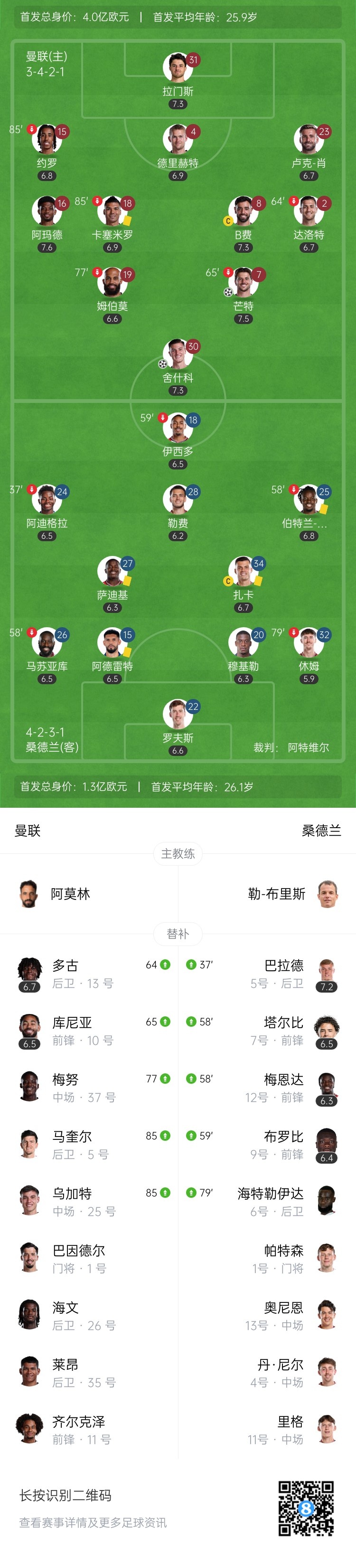 直播吧10月4日讯 北京时间10月4日22:00,2025-26赛季英超联赛第7轮,曼联坐镇老特拉福德球场迎战桑德兰,拉门斯迎来首秀。上半场姆伯莫助攻芒特破门,B费中框,阿玛德头球补射空门顶偏了,舍什科再下一城,曼联暂2-0桑德兰;下半场两队都没能再改写比分,最终曼联2-0桑德兰,迎来赛季第三胜,积分来到10分。