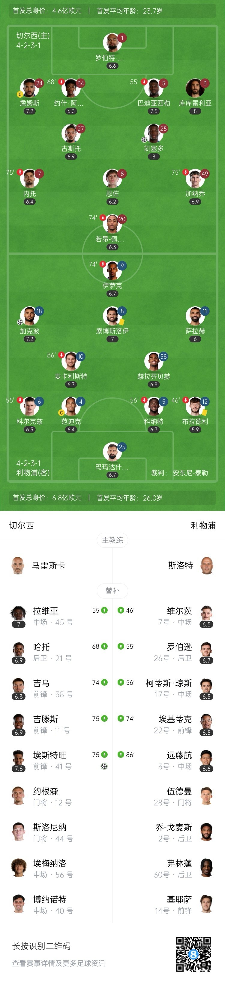 全场比赛结束,切尔西主场2-1战胜利物浦。
