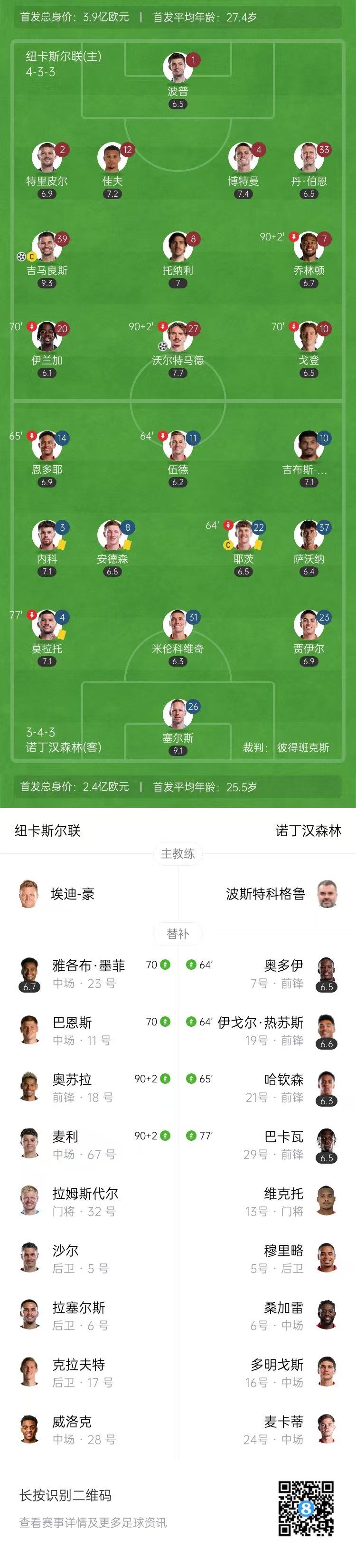 全场比赛结束,纽卡斯尔联2-0诺丁汉森林。