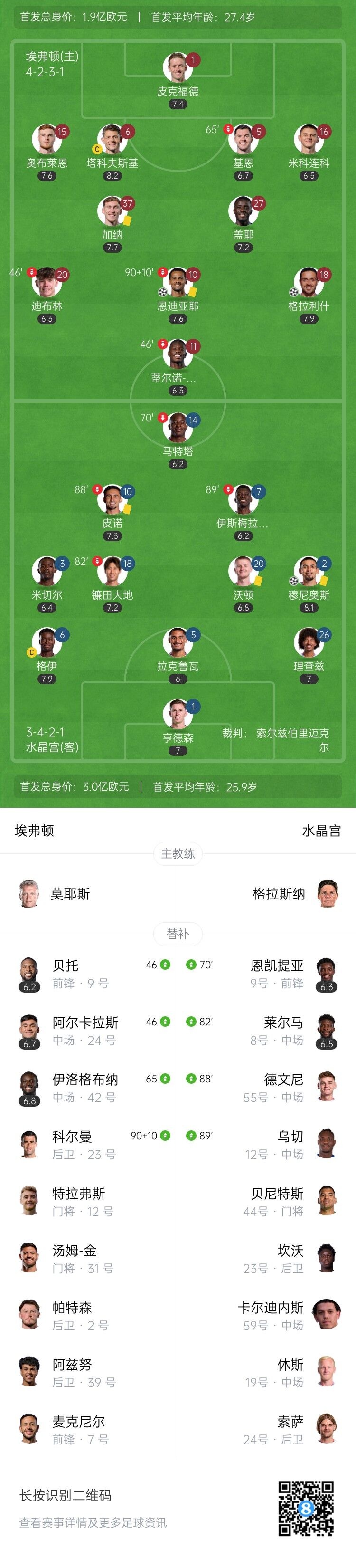 伤停补时8分钟。全场比赛结束,埃弗顿2-1水晶宫。