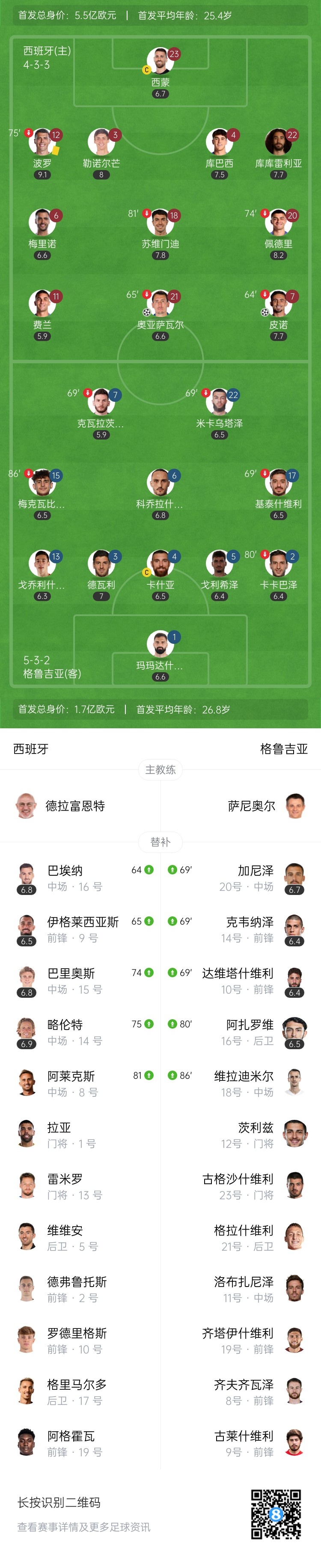下半场补时3分钟。最终全场比赛结束,西班牙2-0格鲁吉亚。