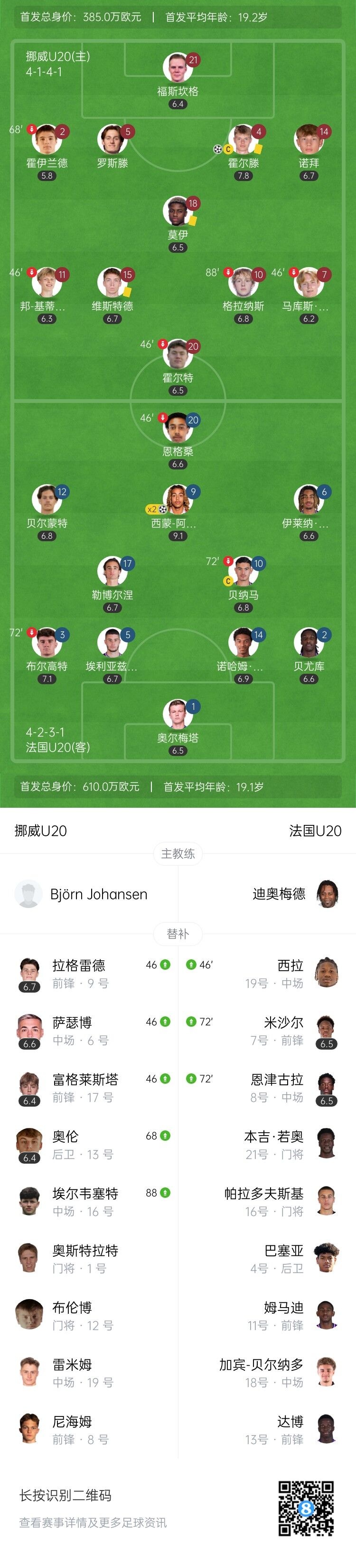 直播吧10月13日讯 北京时间10月13日早上7:00,世青赛1/4决赛,挪威U20在普雷亚安查体育场对阵法国U20。上半场,西蒙-阿布雷梅开二度。下半场,霍尔滕头球扳回一个。全场结束,挪威U20以1-2不敌法国U20。法国U20半决赛的对手将是摩洛哥U20。