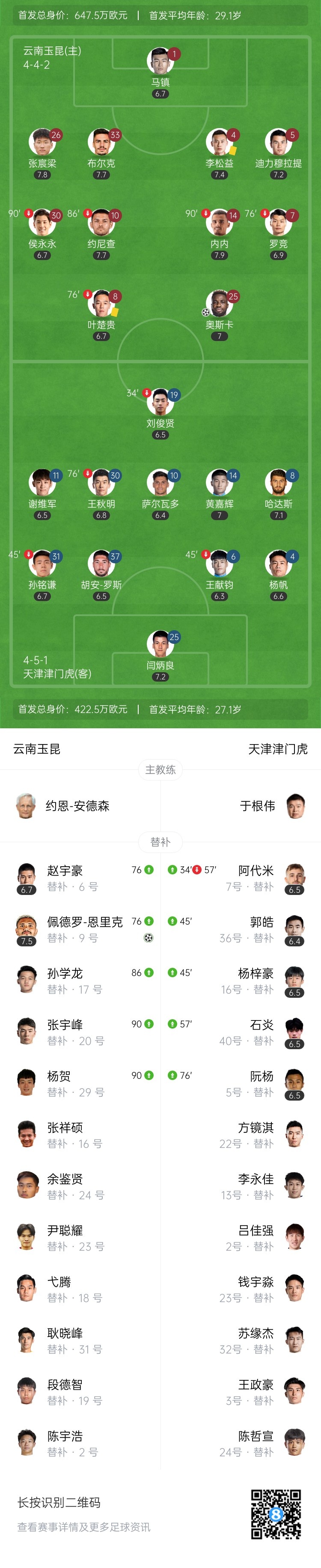 直播吧10月18日讯 北京时间20:00,中超第27轮云南玉昆vs天津津门虎。上半场,王献均送点,奥斯卡点射破门!下半场,恩里克头球破门扩大领先优势!最终,云南玉昆2-0击败天津津门虎,近6轮首胜!