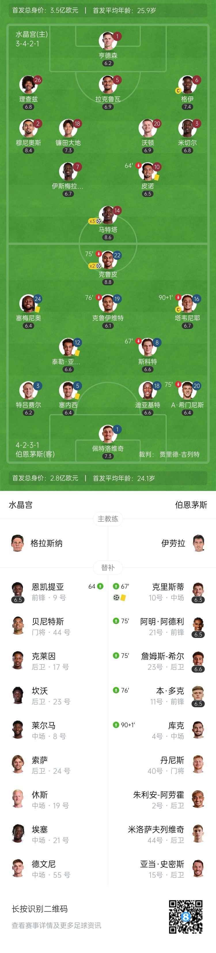 全场比赛结束,伯恩茅斯客场3-3战平水晶宫。