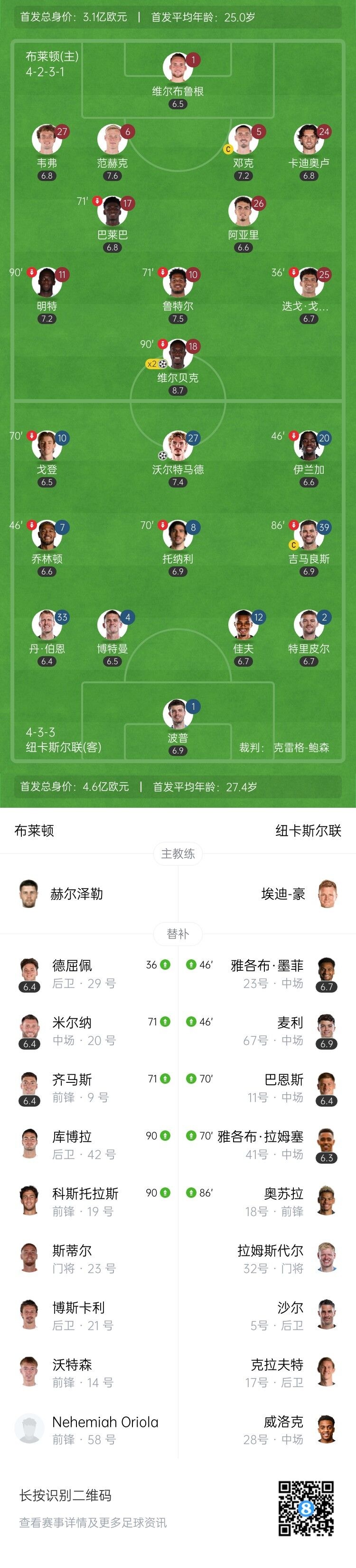 伤停补时6分钟。全场比赛结束,布莱顿2-1纽卡斯尔。
