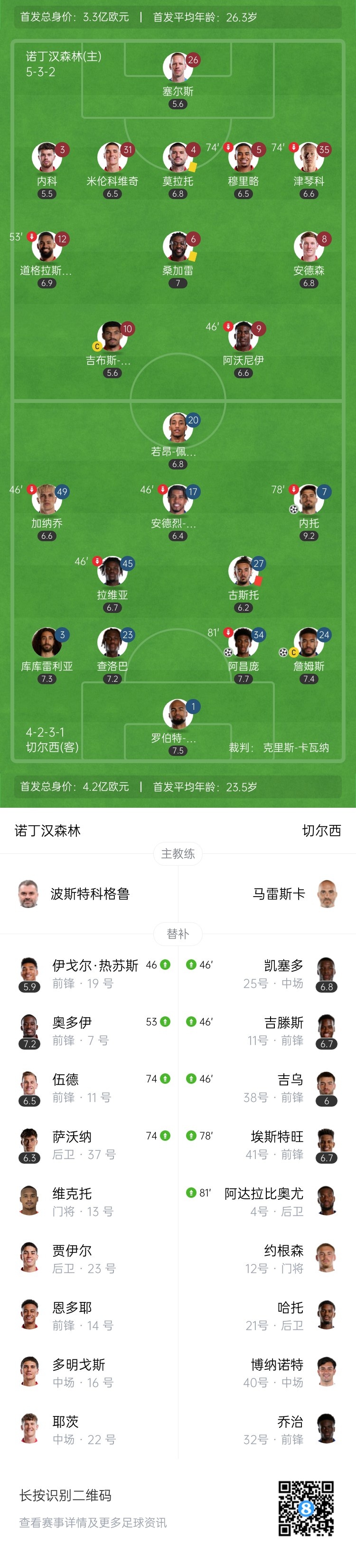 第84分钟,切尔西右侧角球机会,埃斯特旺将球开到门前,塞尔斯击球没有打远,里斯-詹姆斯迎球爆射打进,切尔西3-0诺丁汉森林。↓