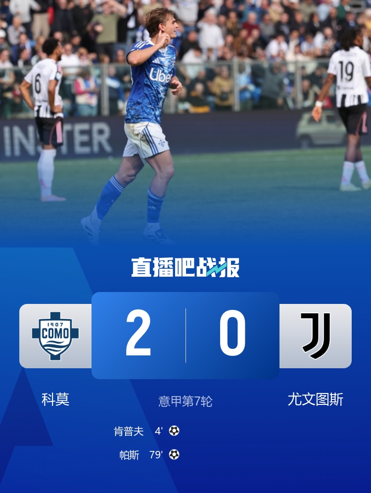 直播吧10月19日讯 北京时间10月19日18:30,意甲第7轮,尤文做客西尼加利亚球场挑战科莫。上半场,科莫闪击,帕斯右路助攻肯普夫破门,戴维打入一球被吹无效;下半场,帕斯反击中左脚劲射破门,佩罗内送助攻。最终,尤文0-2不敌科莫6场不胜,赛季不败终结,科莫5轮不败。积分榜上,尤文积12分位列第6位,科莫同积12分升至第5位。