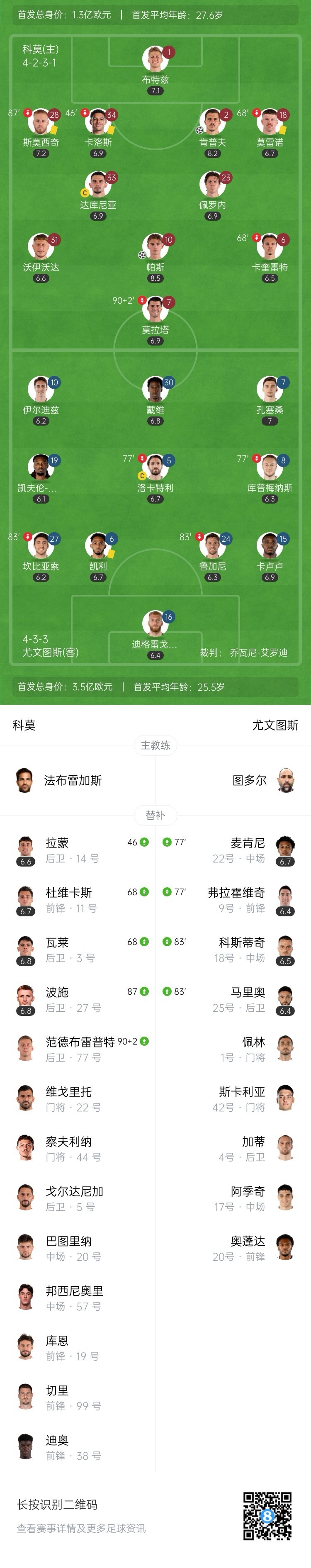 全场比赛结束,尤文0-2不敌科莫。