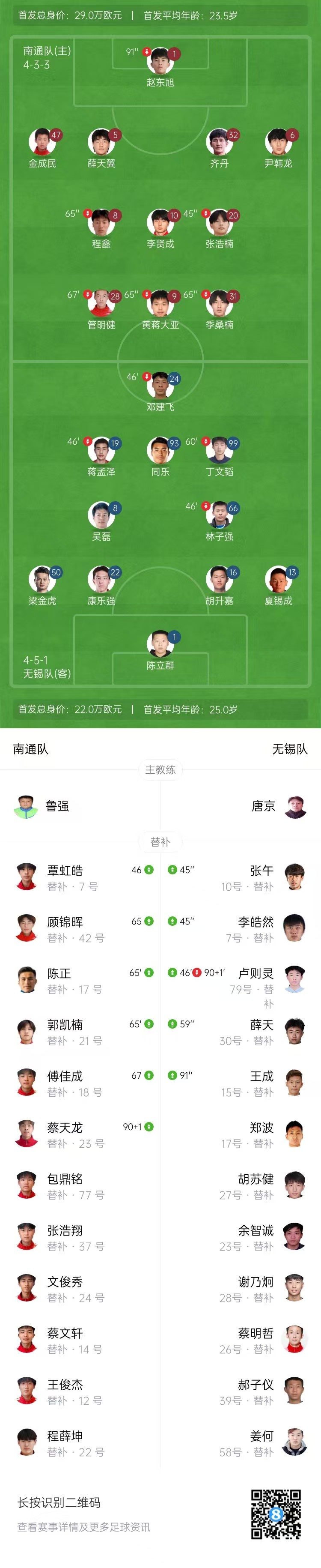 直播吧10月19日讯 北京时间10月19日19点35分,苏超半决赛,南通队对无锡队。上半场,黄蒋大亚单刀没能打上。下半场,薛天错失一次半单刀机会。蔡天龙92分钟替补登场在点球大战中连扑两点。最终南通队点球大战总比分4-2淘汰无锡队。南通队将在决赛中和泰州队争夺冠军,决赛将于11月1日19点35分在南京奥体中心进行。
