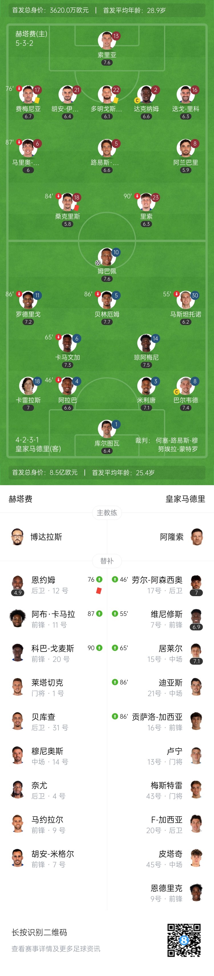 第77分钟,刚刚替补登场仅1分钟的恩约姆对维尼修斯暴力犯规染红,赫塔费少打一人↓