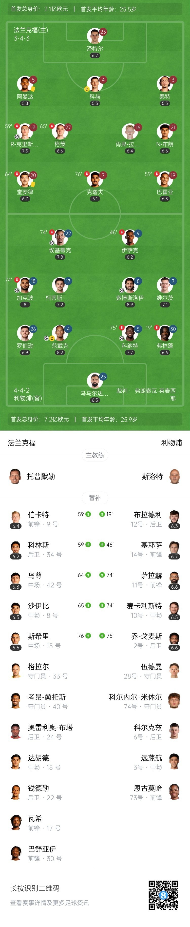 全场比赛结束,利物浦客场5-1逆转法兰克福。