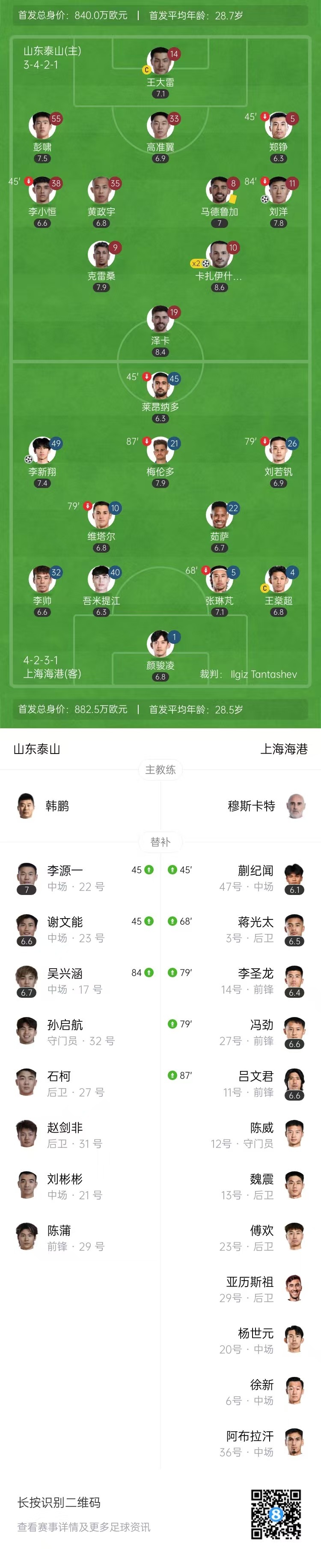 全场比赛结束,山东泰山3-1上海海港。