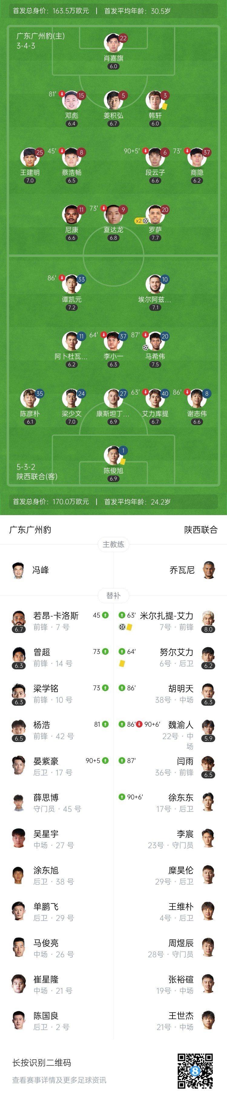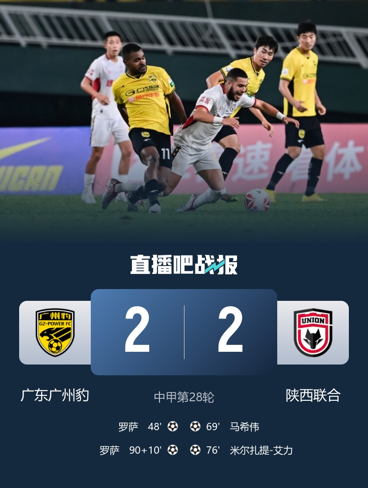 全场比赛结束,广州豹2-2绝平陕西联合。