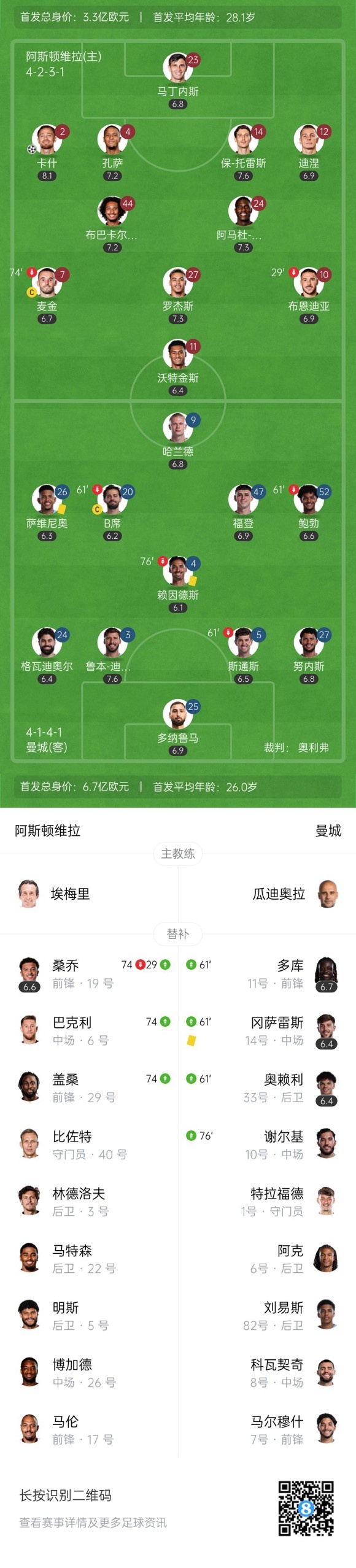 下半场补时6分钟,维拉1-0曼城。