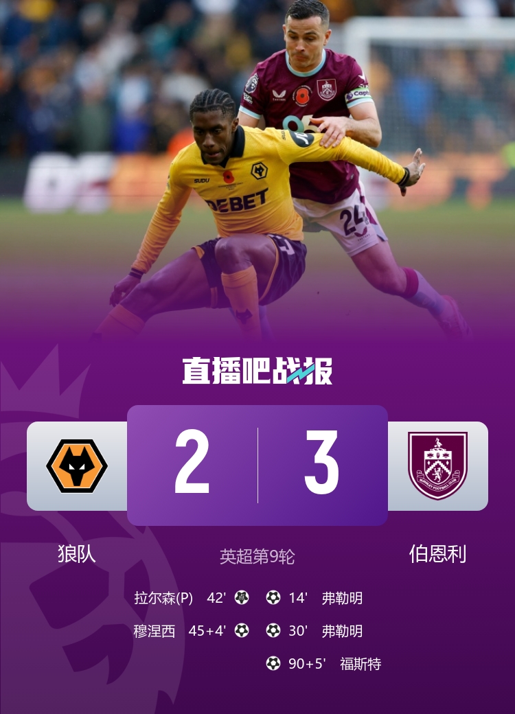 全场比赛结束,狼队2-3伯恩利。