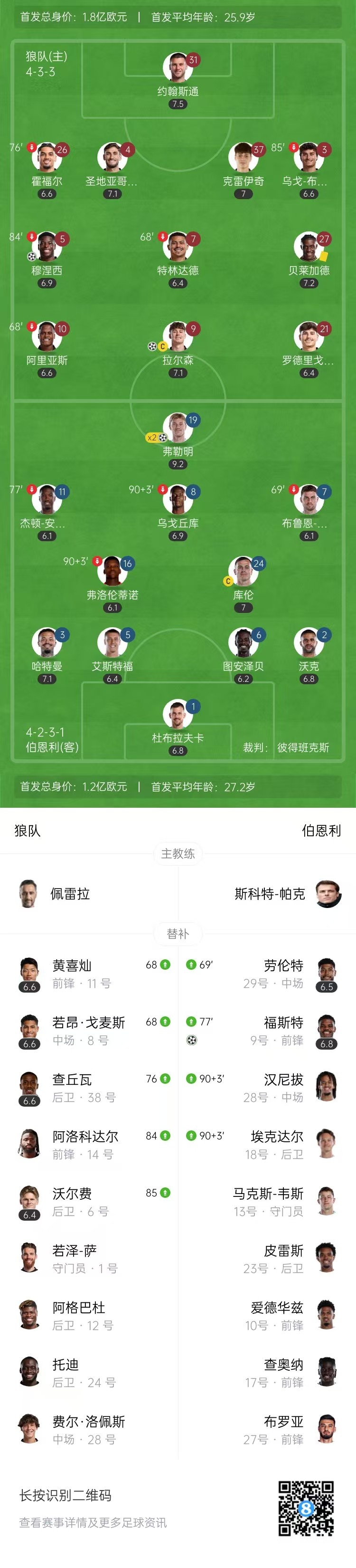 第45+4分钟,贝莱加德禁区前沿送出挑传,后点将球摆渡,穆涅西门前头球扳平比分,狼队2-2伯恩利。↓