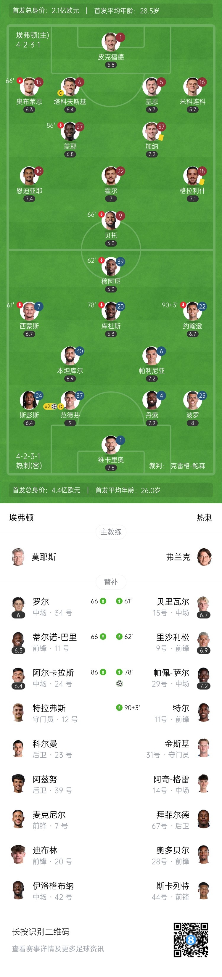 直播吧10月27日讯 北京时间0:30,英超第9轮埃弗顿vs热刺,比赛在希尔迪金森球场打响!上半场,范德芬梅开二度,本坦库尔、波罗献助攻!奥布莱恩进球被吹。里沙利松失单刀;维卡里奥屡献神扑!比赛尾声阶段,里沙利松助攻萨尔破门!最终,热刺客场3-0完胜埃弗顿,升至英超第3名!