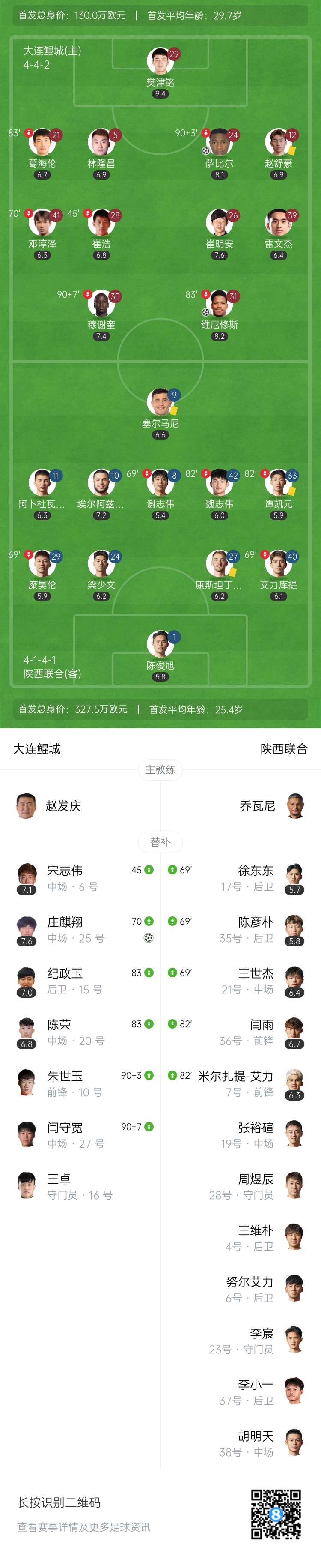 第70分钟,大连鲲城左路传中,陕西联合迟迟无法解围,穆谢奎禁区中倒钩射门被扑!萨比尔后点补射破门!大连鲲城2-0领先陕西联合↓