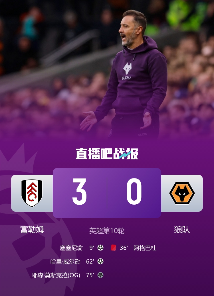 直播吧11月2日讯 北京时间11月1日晚23时整,2025-26赛季英超第10轮在克拉文农场球场展开角逐,富勒姆主场迎战狼队。上半场塞塞尼翁首开记录,阿格巴杜直红离场,下半场哈里-威尔逊扩大比分,莫斯克拉乌龙球。最终富勒姆主场3-0完胜十人狼队,富勒姆终结英超4连败,狼队开局10轮不胜仍垫底。