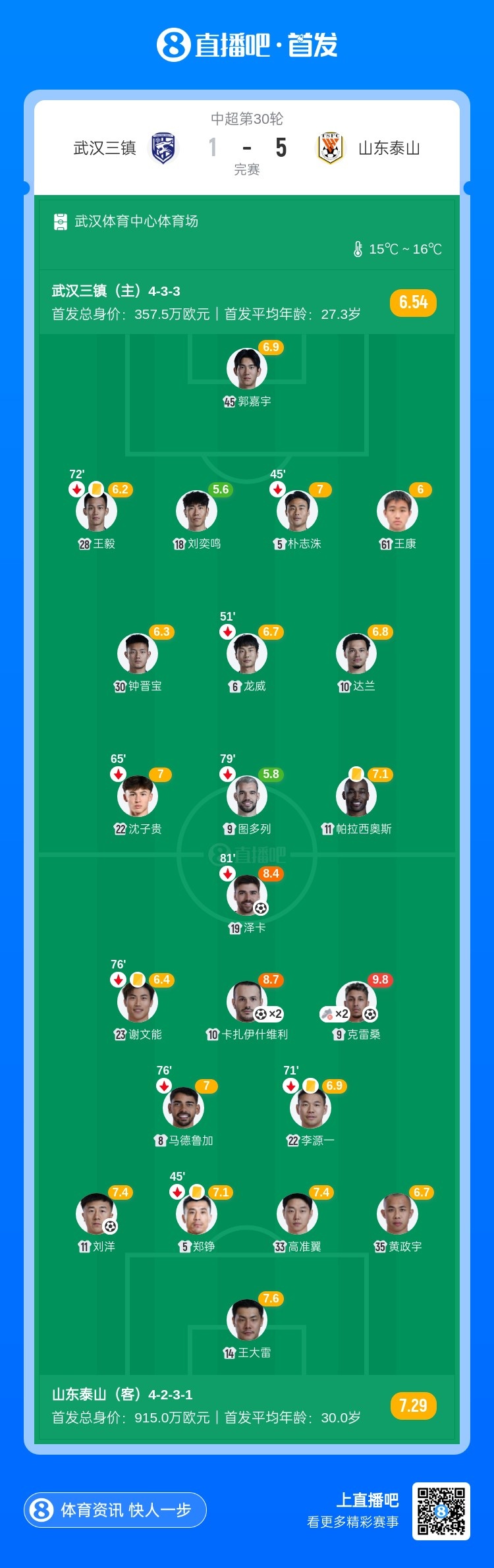 直播吧11月22日讯 北京时间15:30,中超第30轮武汉三镇vs山东泰山,比赛在武汉体育中心体育场打响!上半场,达兰头球补射因越位被判无效;随后图多列、卡扎伊什维利先后进球被吹!卡扎中柱;泽卡抽射破门帮助泰山取得领先!半场补时阶段,刘洋包抄破门!下半场,泽卡造点,卡扎伊什维利点射破门!汪晋贤造点,图多列主罚点球被王大雷扑出!卡扎伊什维利低射完成双响!克雷桑尾声阶段再下一城。最终,山东泰山5-1击败武汉三镇,泰山中超第5收官,三镇排名第13。