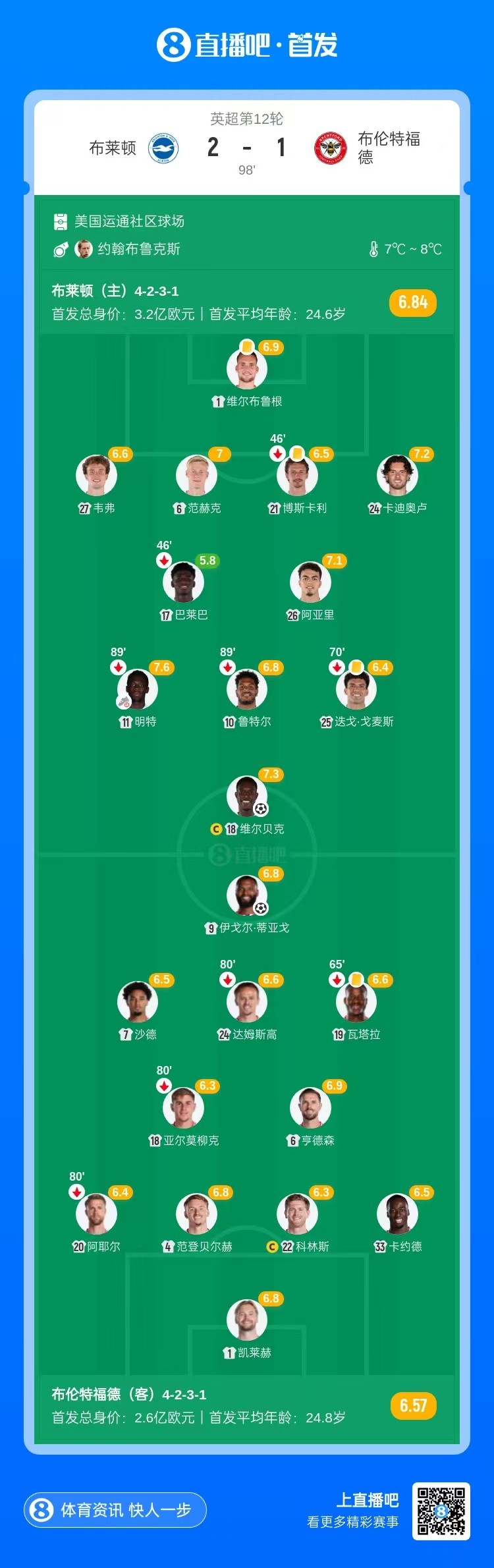 第71分钟,布莱顿右路传中,维尔贝克插上包抄破门!布莱顿1-1扳平布伦特福德↓