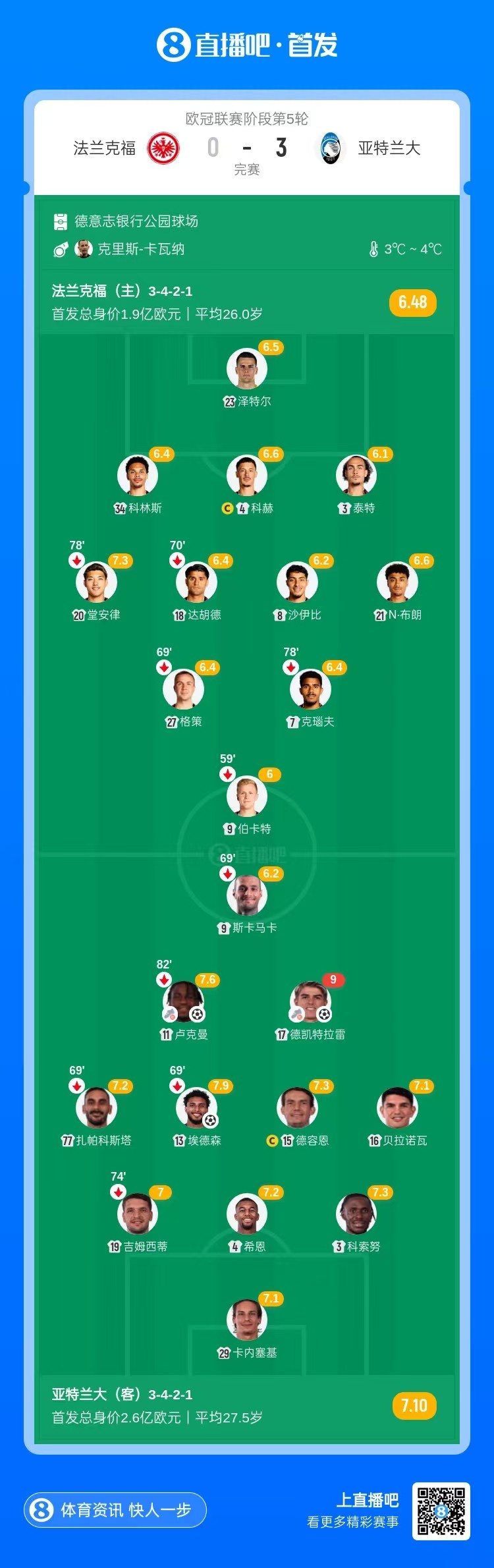 直播吧11月27日讯 北京时间4:00,欧冠联赛阶段第5轮,法兰克福vs亚特兰大,比赛在德意志银行公园球场打响!上半场,亚特兰大两度中柱。下半场,卢克曼2分钟传射建功,埃德森破门,随后德凯特拉雷进球同样完成传射!最终,亚特兰大3-0击败法兰克福。
