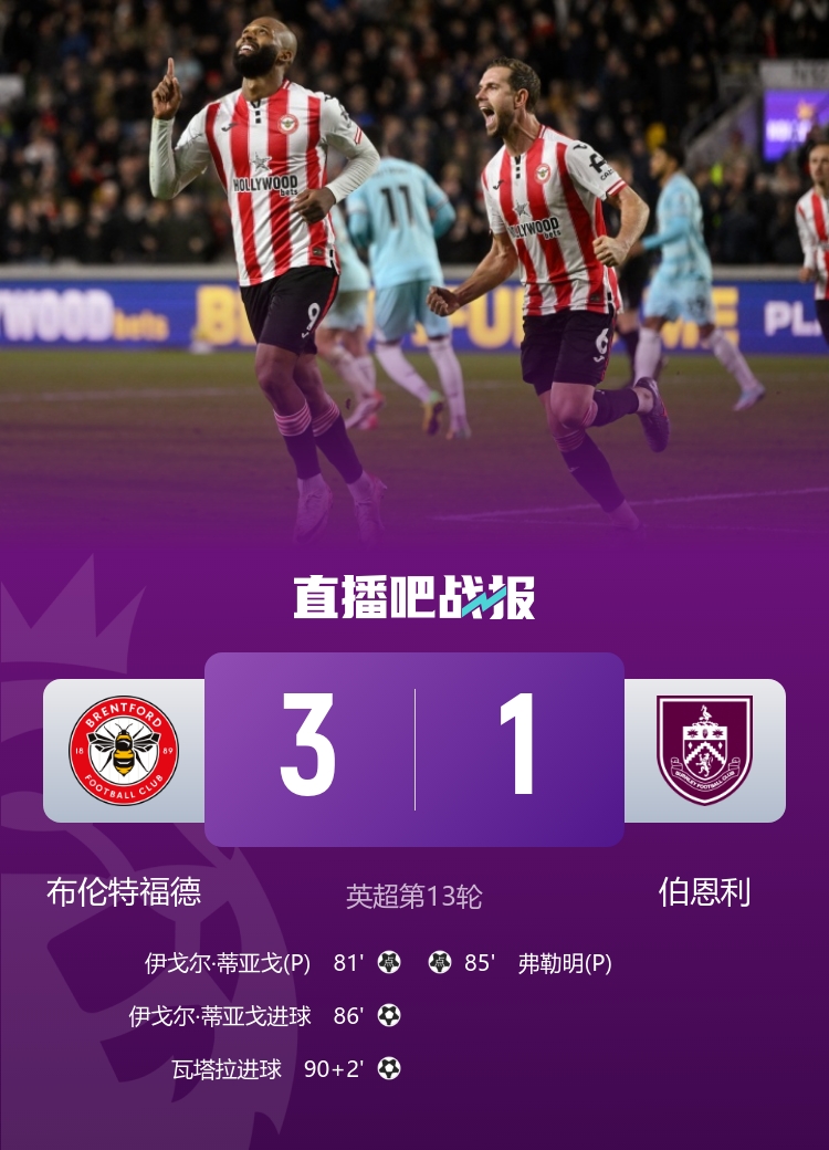 伊戈尔·蒂亚戈主罚点球命中,布伦特福德1-0伯恩利。↓