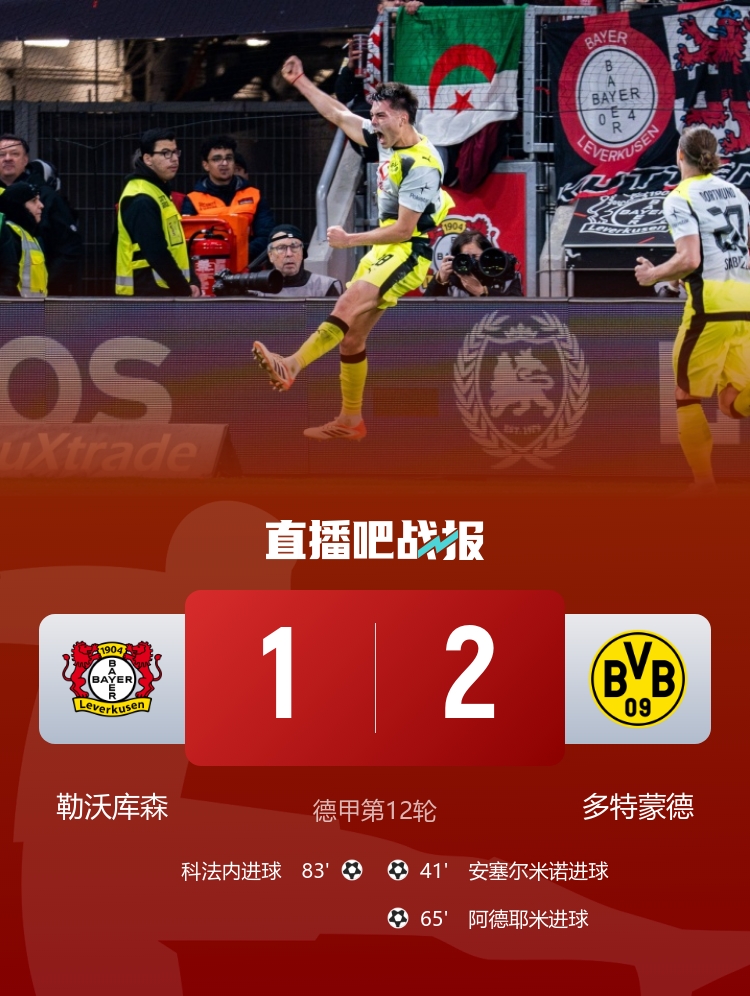 直播吧11月30日讯 德甲第12轮,勒沃库森坐镇主场拜尔竞技场迎战多特蒙德。上半场,安塞尔米诺先拔头筹。易边再战,阿德耶米再下一城,科法内扳回一球,霍夫曼、波库中框,布兰特失单刀。最终勒沃库森1-2多特蒙德。积分榜方面,多特25分升至第三,勒沃库森23分第四。