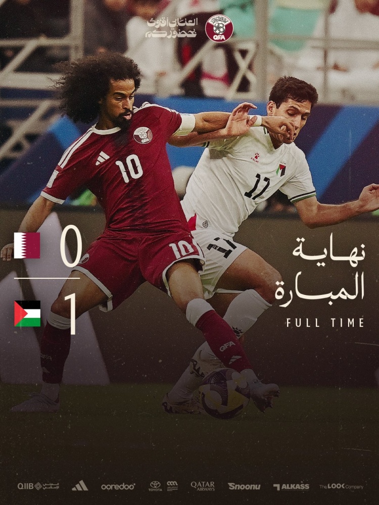 上半场两队均无建树,下半场第95分钟巴勒斯坦边路传中,布雷克不慎乌龙,巴勒斯坦1-0绝杀卡塔尔。
