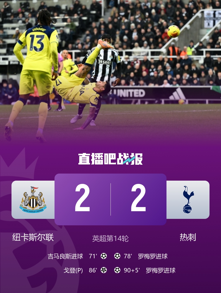 直播吧12月3日讯 北京时间12月3日04:15,英超联赛第14轮热刺挑战纽卡的比赛在圣詹姆斯公园球场进行,上半场乔林顿低射中柱,贝里瓦尔蝎子摆尾式打门造险,下半场巴恩斯失单刀,丹索门线解围,沃尔特马德助攻吉马良斯抽射打破僵局,库杜斯助攻罗梅罗头球扳平,本坦库尔送点,戈登点射破门,罗梅罗倒钩绝平,最终热刺2-2纽卡五轮不胜。