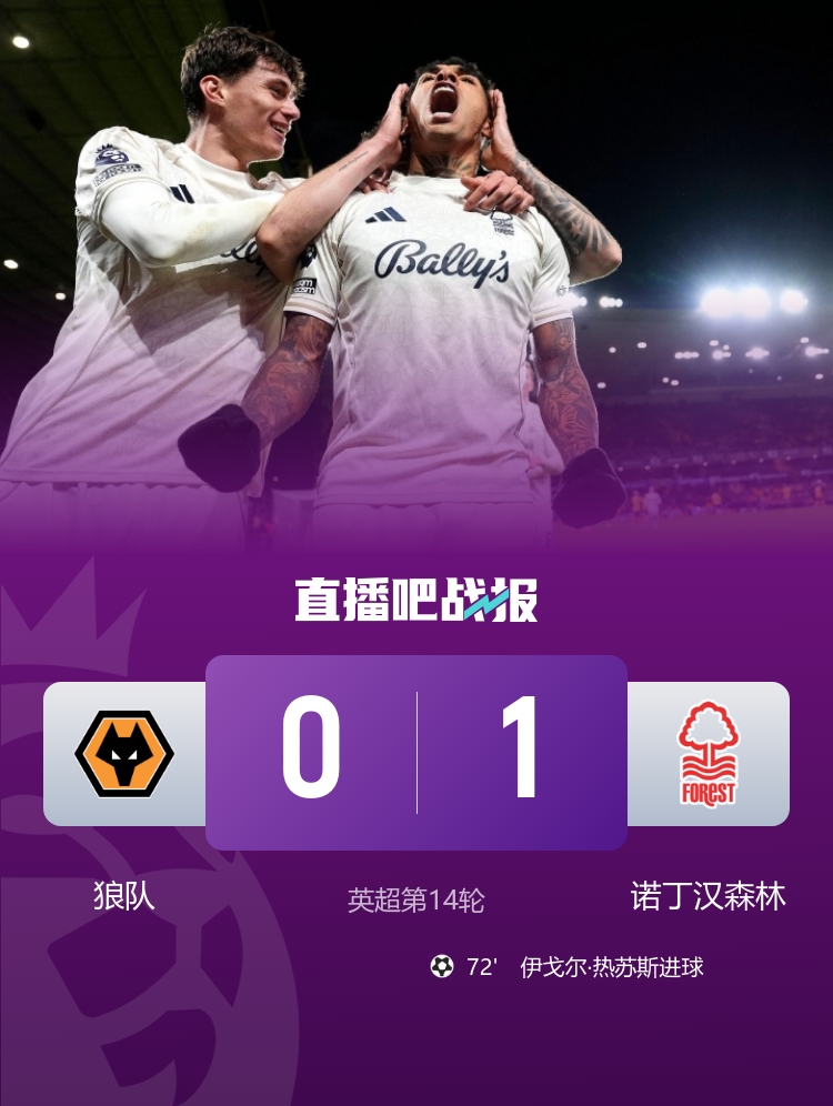 直播吧12月4日讯 英超第14轮比赛,狼队主场0-1不敌诺丁汉森林。