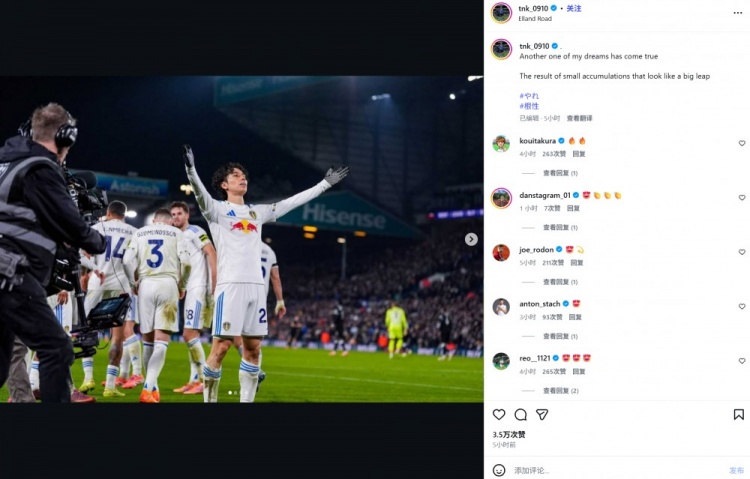 本场比赛日本国脚田中碧打进精彩进球,这也是他生涯英超首粒进球。田中碧在社媒晒出本场庆祝进球照片,配文写道:“我又实现了自己的一个梦想,看似巨大的飞跃实则源于点滴积累。”