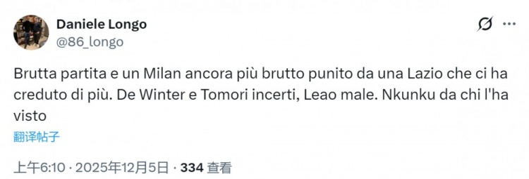 米兰跟队记者隆戈在社交媒体上写道:“一场糟糕的比赛,米兰表现更是糟糕,被更具求胜信念的拉齐奥惩罚。德温特和托莫里表现不稳,莱奥发挥不佳,至于恩昆库——看过比赛的人都会问,他到底在哪里?”