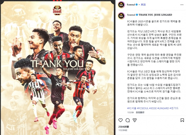 首尔FC宣布,2025赛季结束后与林加德合同结束,正式分道扬镳。